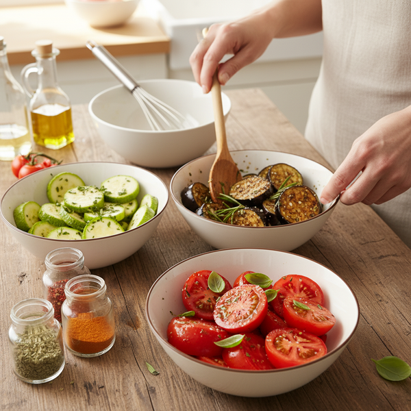 2. Lightly brush the zucchini, eggplant, and tomatoes with Lemon-infused olive oil.